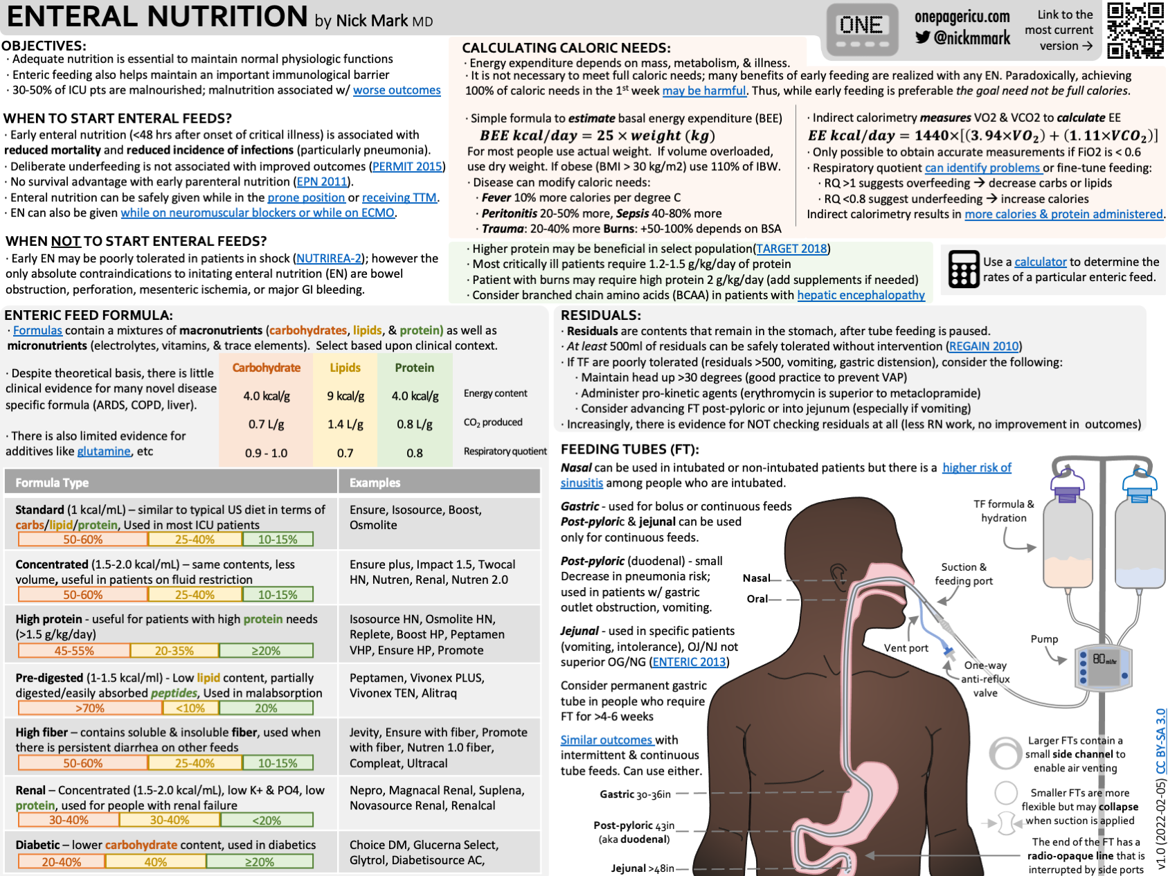 As usual, Nick Mark over at onepagericu.com has you covered. This great ICU One Pager (PDF or PPT) on Enteral Nutrition covers everything you, as an ICU provider, need to know. This will at least help you get started until you can consult your local RD, or help you to provide proper nutritional therapy for your patients if you don’t have an RD available.